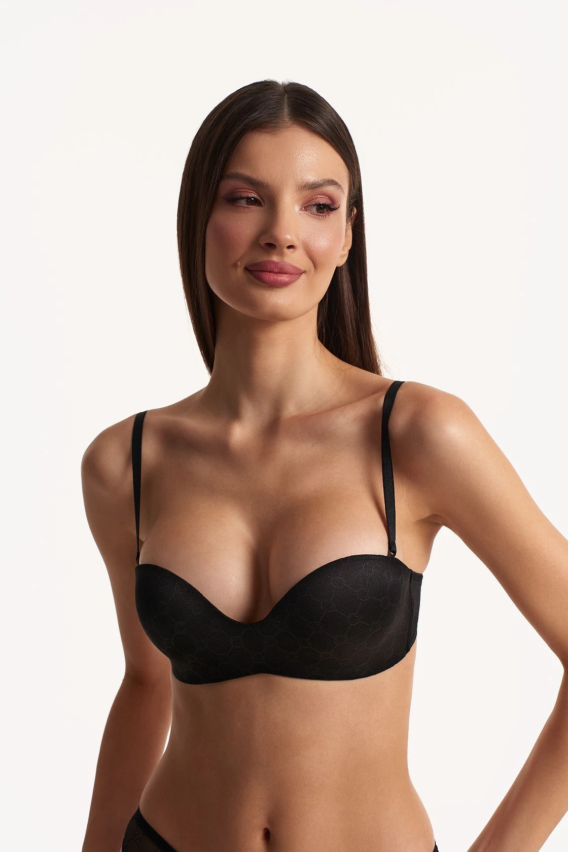 Бюстгальтер без каркасов с эффектом пуш-ап. Новая форма супер-бра из биэластичного полотна, стан с подкладкой. Материал с использованием переработанного сырья (recycling). Съемные бретели позволяют носить бюстгальтер с бретелями крест-накрест.