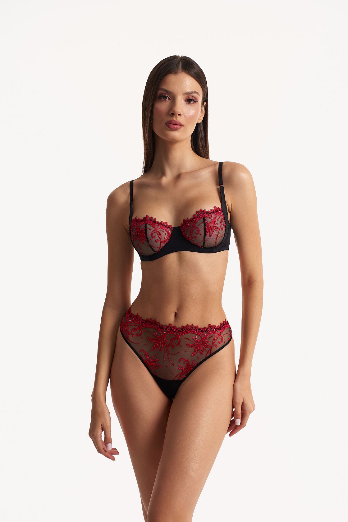 Бюстгальтер из эластичного сетчатого полотна с вышивкой. В модели двойная боковая деталь для наиболее хорошей поддержки. Вытачка придает объем и красивую форму груди.