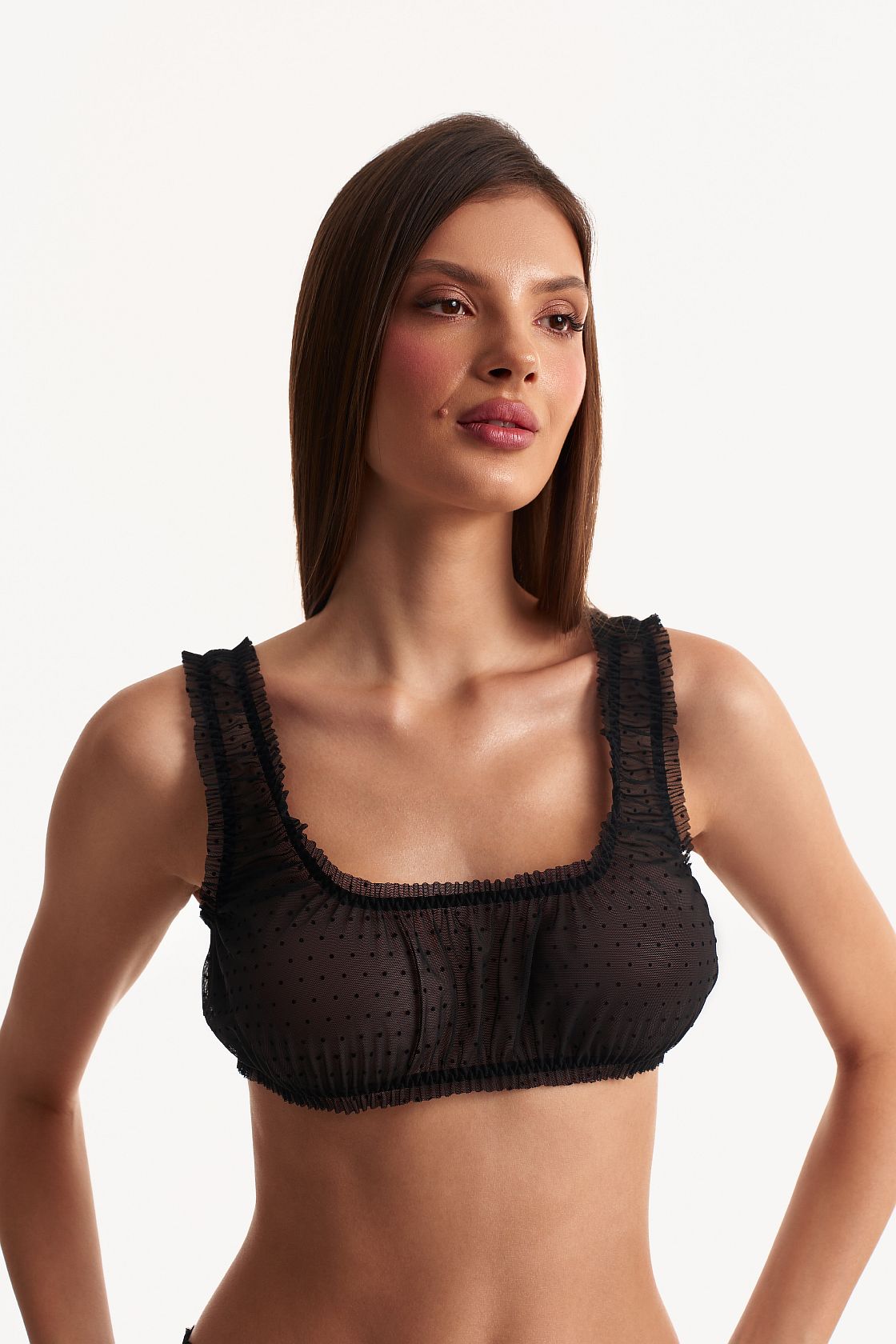 Топ изготовлен из сетчатого полотна с набивкой в технике "флок".